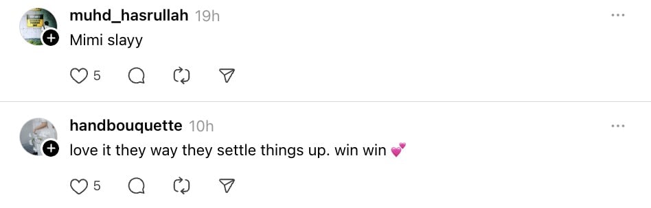 Mimi atau nama sebenarnya Mimi Roziana Zainal Abidin, 31, membalas hantaran Aizat di Threads, yang dipercayai ditujukan kepadanya berhubung tunggakan bayaran sejumlah RM250.