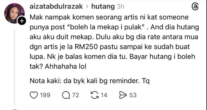 “Lepas tu sampai ke sudah buat lupa. Nak saja balas komen dia tu. Bayar hutang saya boleh tak? Dah banyak kali bagi peringatan,” tulis Aizat dalam hantaran tersebut.