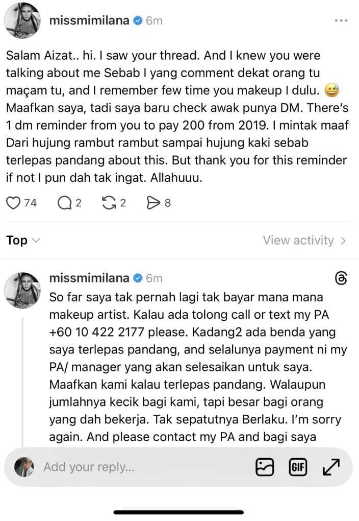 “Salam Aizat. Saya nampak Threads awak dan saya tahu awak bercakap tentang saya sebab saya yang komen pada orang tu macam tu. Dan saya masih ingat awak mekap saya beberapa kali dulu.