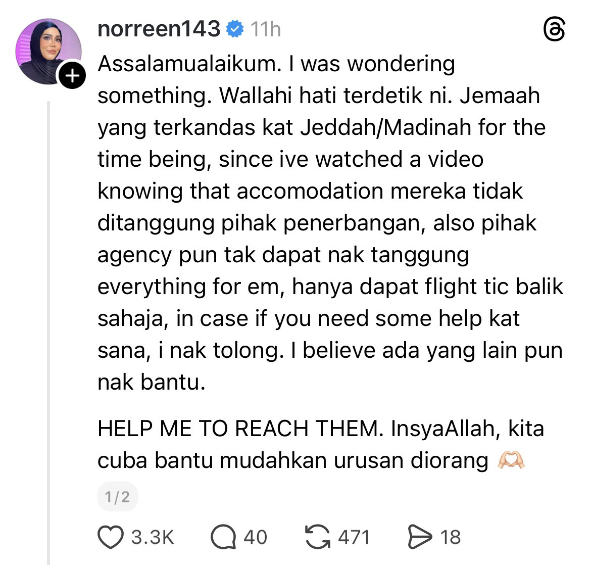 “In case if you need some help kat sana, saya nak tolong. Saya percaya ada yang lain pun nak bantu. Help me to reach them. InsyaAllah, kita cuba bantu mudahkan urusan mereka,” tulisnya.