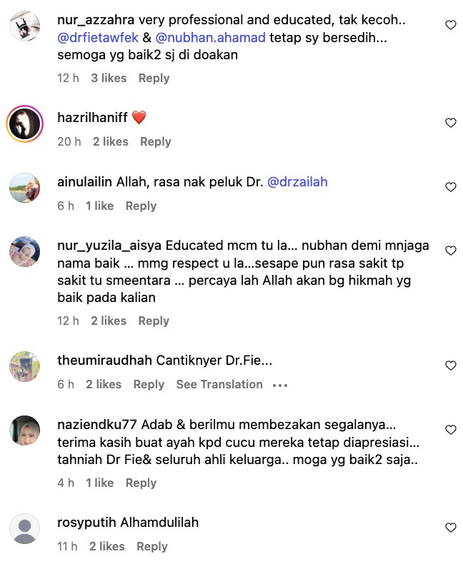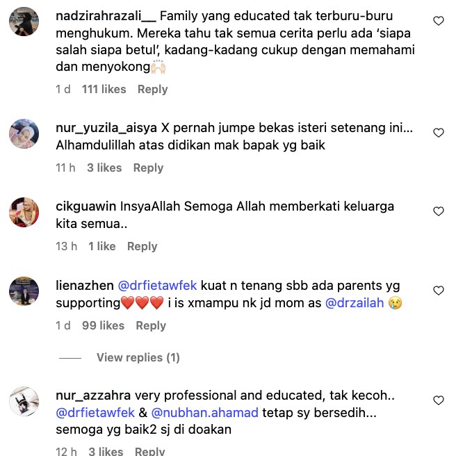 Perkongsian tersebut telah mendapat perhatian ramai apabila memuji kedewasaan Dr Zailah yang tetap menghormati Nubhan walaupun bekas menantunya, menyifatkan beliau sebagai ibu yang wajar dicontohi.
