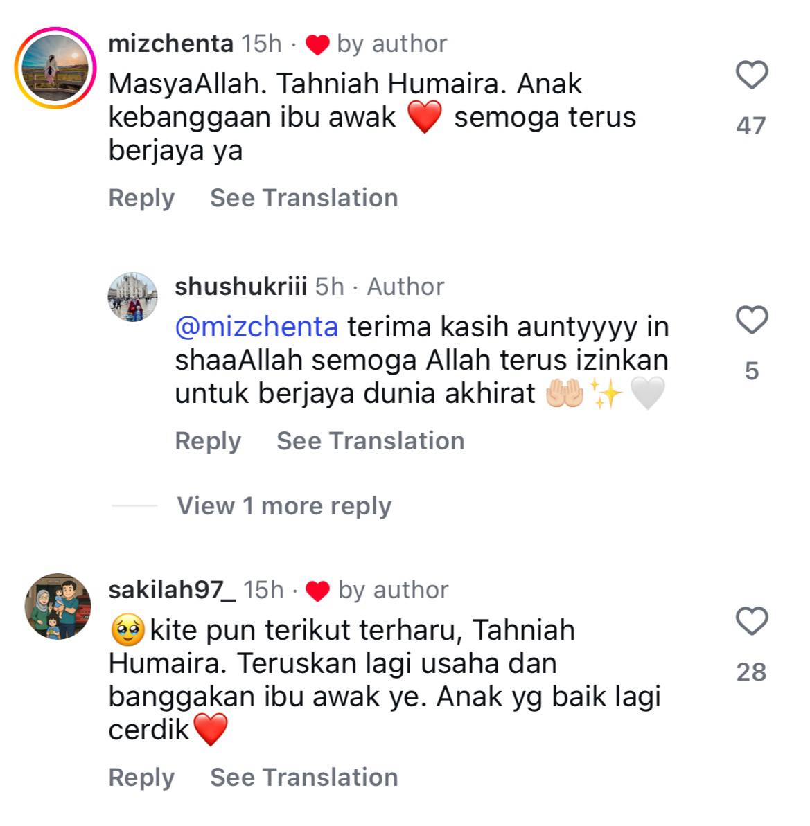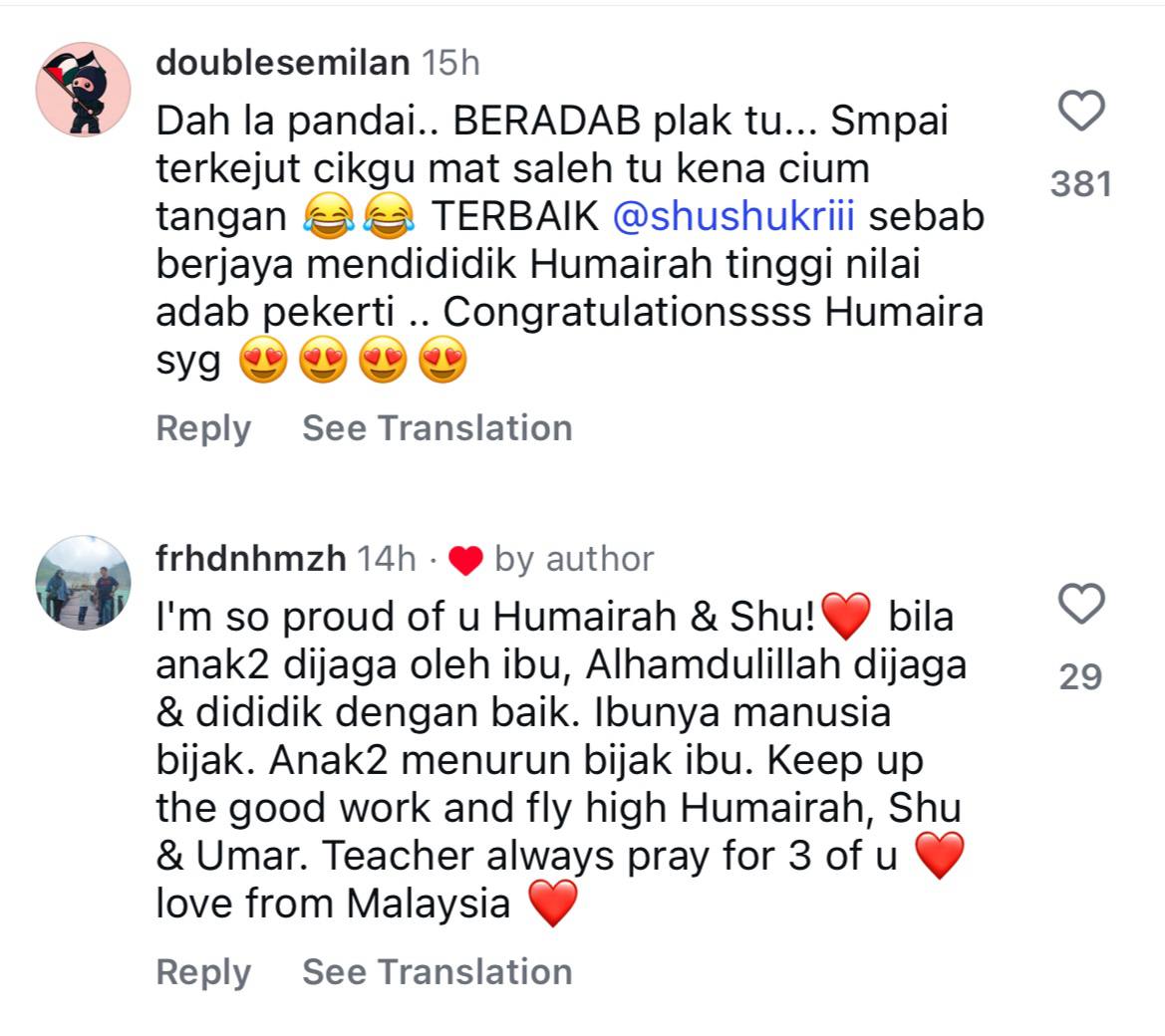 Meninjau ke ruangan komen, warganet memuji Humairah sebagai seorang anak yang cerdik dan mendoakannya agar terus sukses dalam menuntut ilmu.