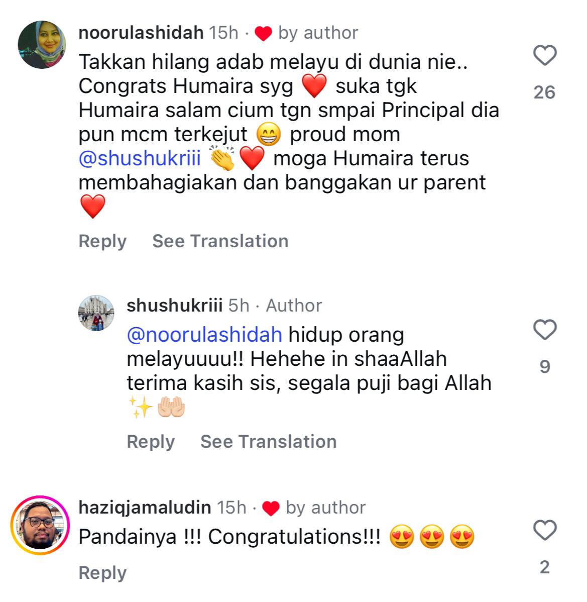 “Wahai anakku Humairah, ibu bangga dengan kamu,bangga dengan pencapaian akademik dan kokurikulum, dengan adab kamu, dengan senyuman dan akhlak kamu, tahniah,” kata Shuhada, hari ini.