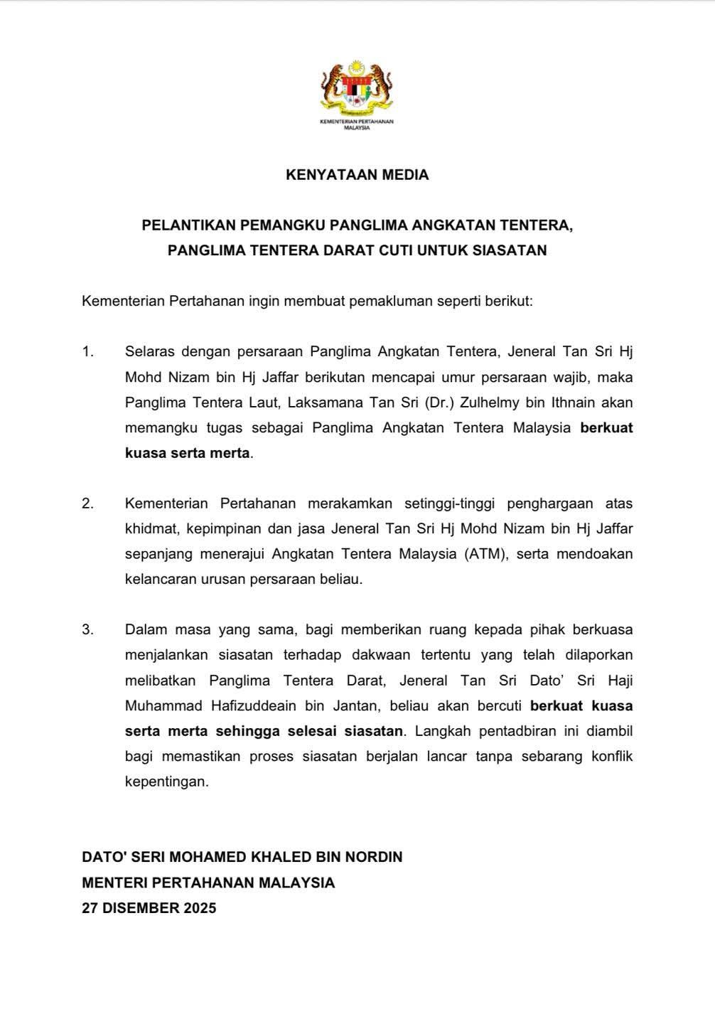 Panglima Tentera Darat, Muhammad Hafizuddeain Jantan diarahkan bercuti serta-merta bagi memberi ruang kepada pihak berkuasa menyelesaikan siasatan berhubung dakwaan tertentu yang dilaporkan membabitkan beliau.