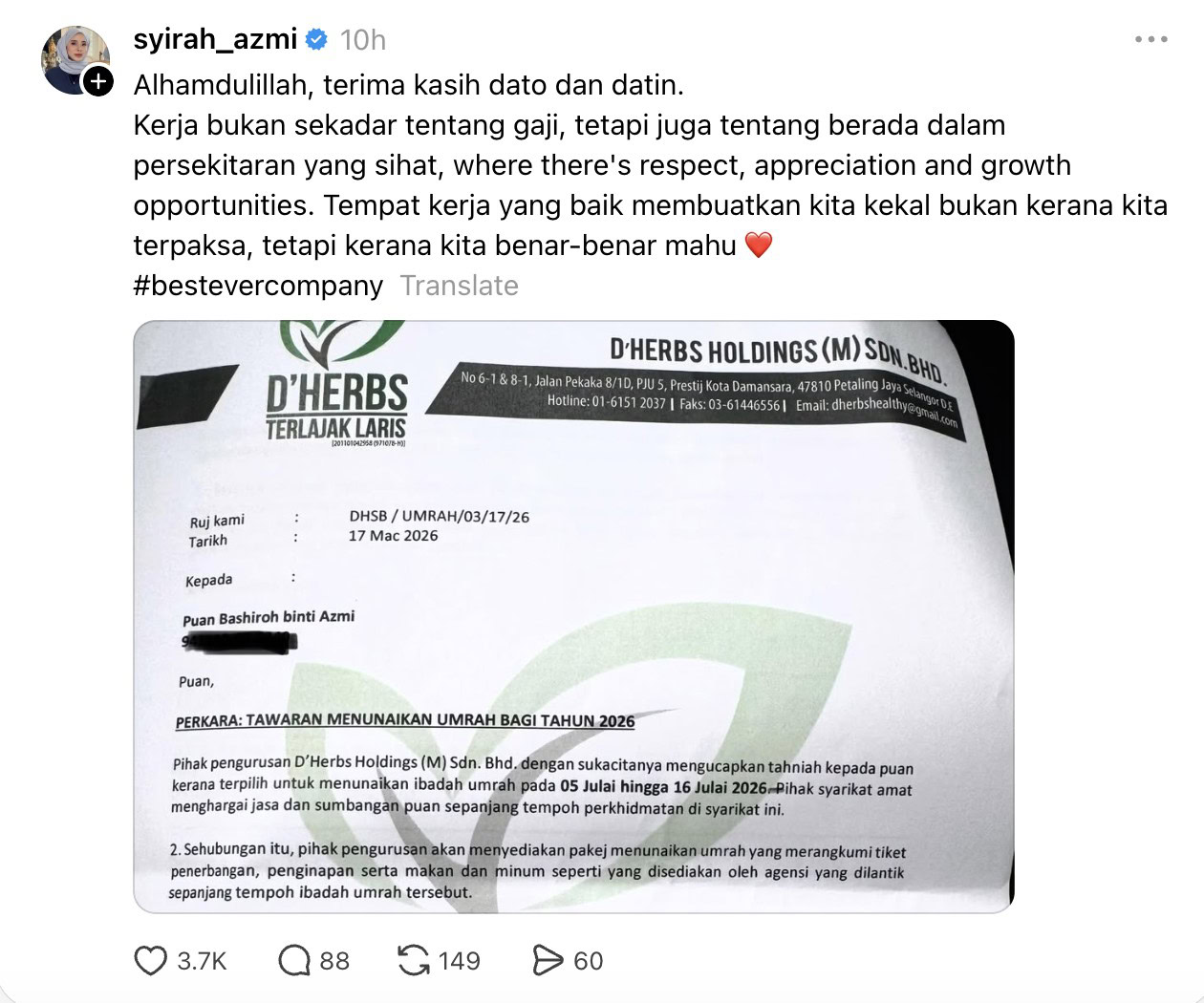 Perkongsian berkenaan turut menarik perhatian ramai yang memuji inisiatif syarikat dalam menghargai sumbangan pekerja, khususnya melalui ganjaran berbentuk pengalaman kerohanian seperti ibadah umrah.
