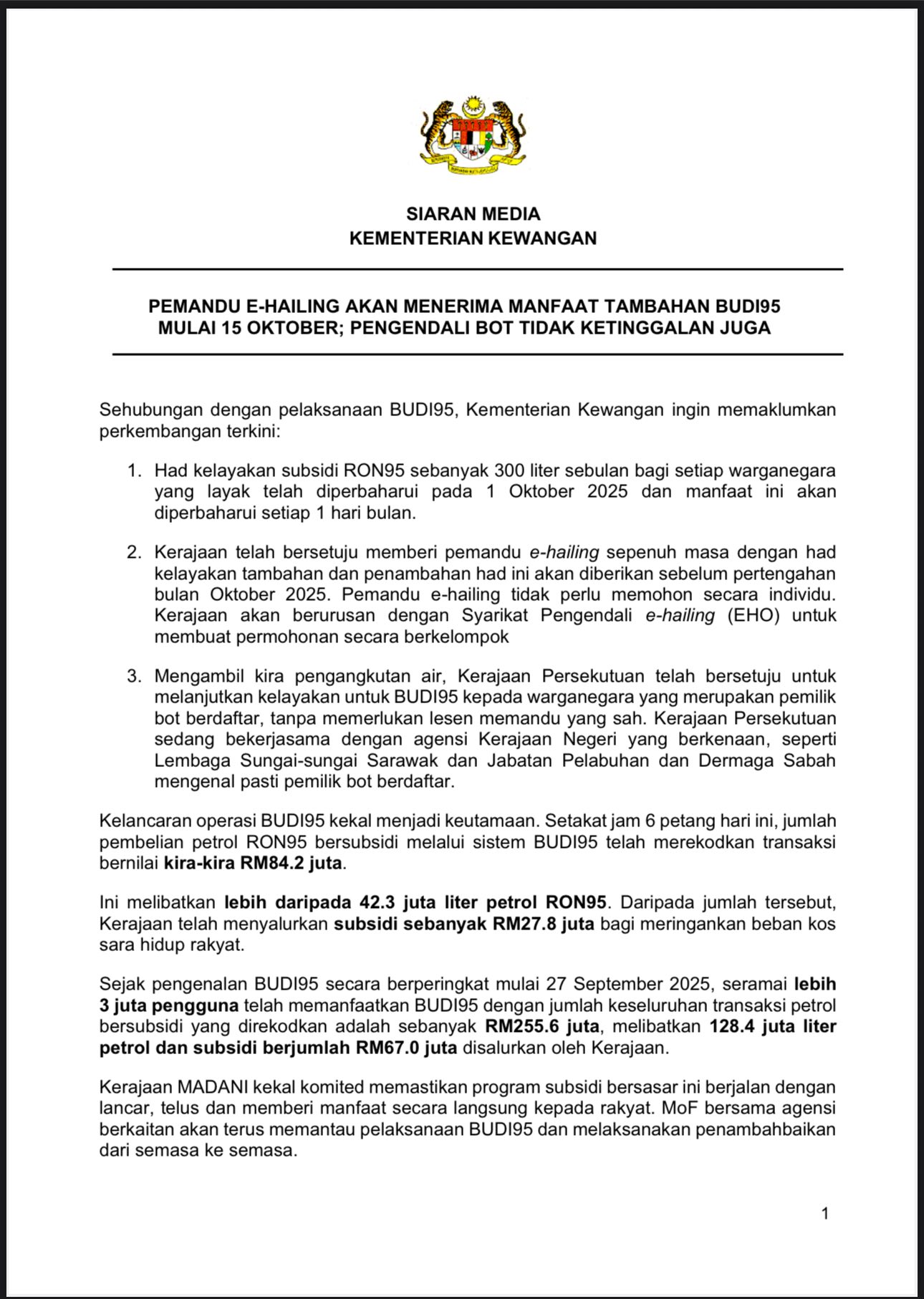 Kementerian Kewangan memaklumkan, pemandu e-hailing sepenuh masa akan menerima manfaat tambahan BUD195 bermula 15 Oktober 2025 selaras pelaksanaan program subsidi petrol bersasar BUDI95.