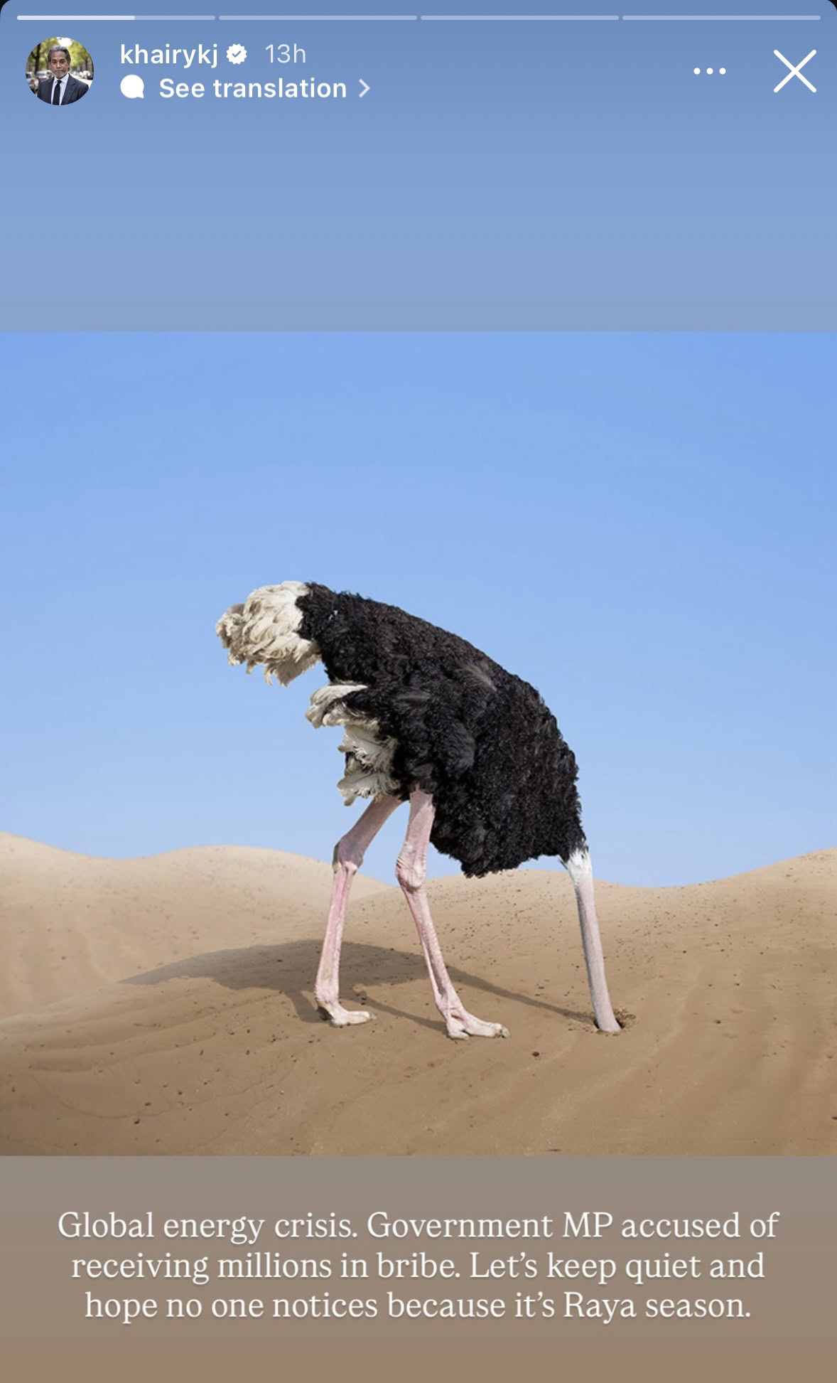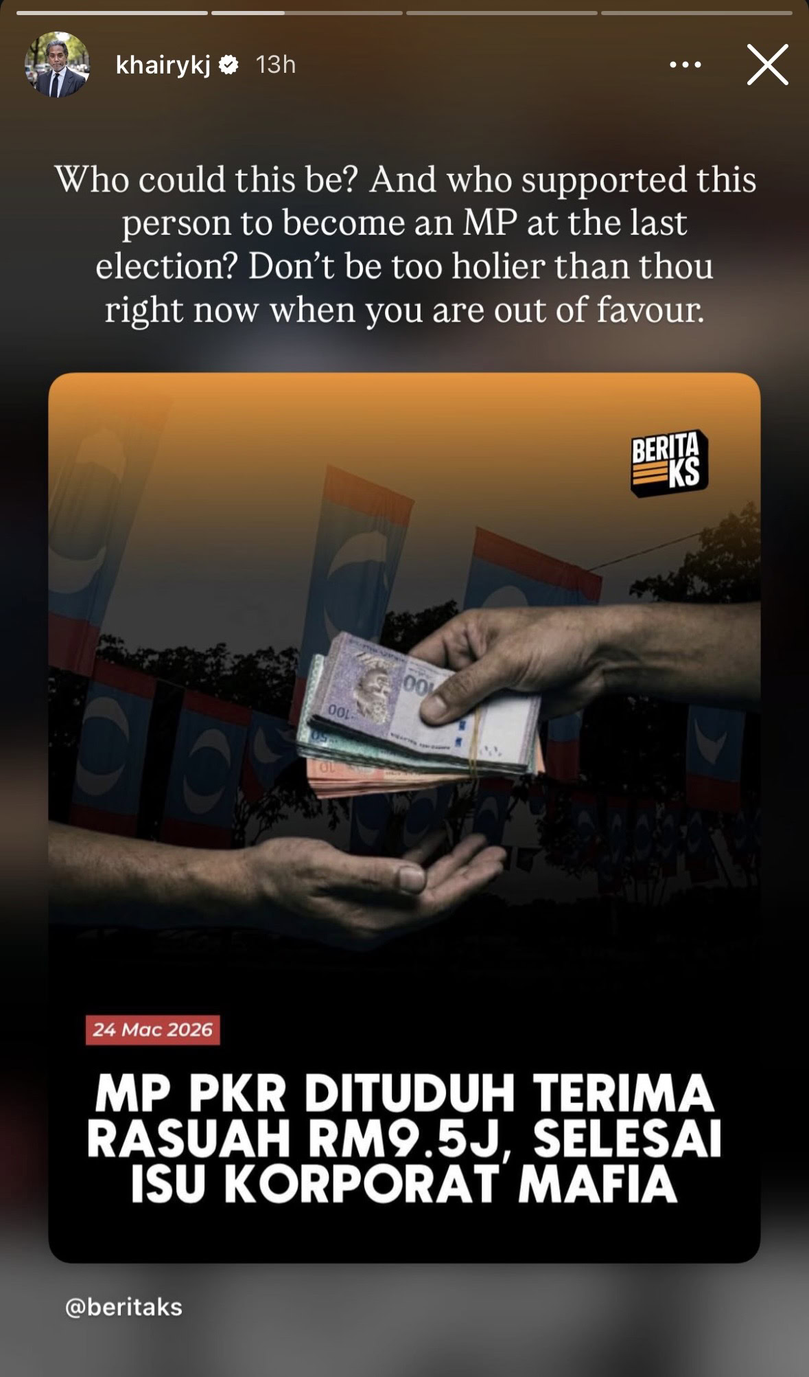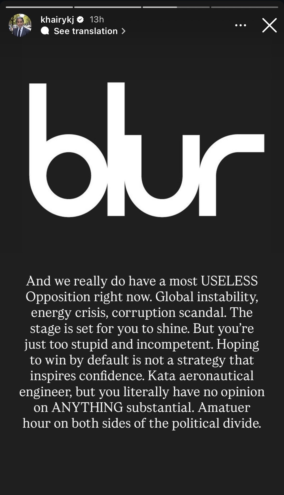 Dalam kenyataannya di Insta Story, Khairy menyorot beberapa isu tempatan dan antarabangsa yang sepatutnya menjadi fokus pembangkang, termasuk krisis tenaga global akibat konflik di Asia Barat dan dakwaan rasuah RM9.5 juta yang dikaitkan dengan ahli Parlimen Parti Keadilan Rakyat oleh Victor Chin.