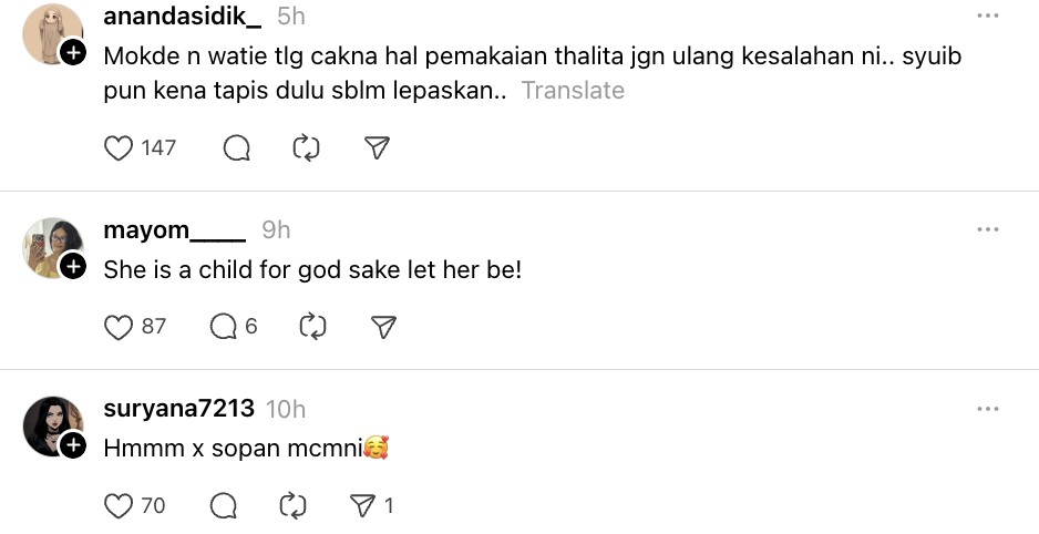 Penampilan anak perempuan kepada pelawak Shuib, iaitu Thalita ketika menghadiri sebuah majlis gender reveal baru-baru ini mencetuskan perbincangan di media sosial apabila menerima kritikan daripada segelintir netizen yang menganggap ia kurang sesuai dengan usianya.