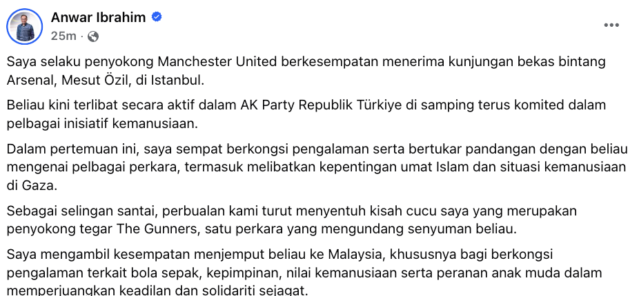 Menerusi perkongsian di media sosial, Anwar menyatakan Özil kini aktif bersama AK Party Republik Türkiye serta terlibat dalam inisiatif kemanusiaan dan sempat bertukar pandangan mengenai pelbagai perkara, termasuk pengalaman dan nilai kepimpinan.