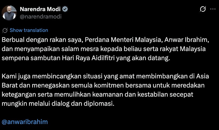 Modi juga turut memuat naik hantaran di platform X menyampaikan ucapan sempena Aidilfitri selain membincangkan situasi semasa yang semakin membimbangkan susulan konflik di rantau berkenaan.