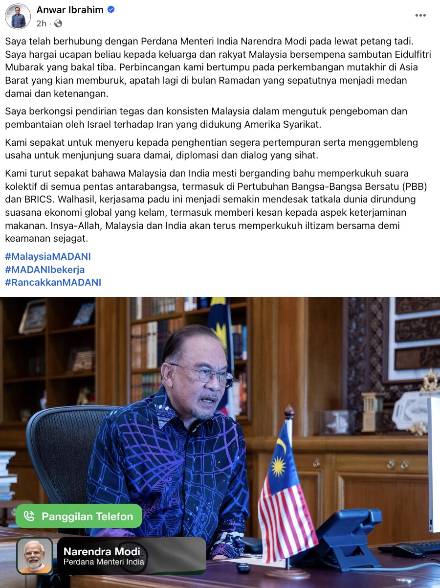 Perdana Menteri Datuk Seri Anwar Ibrahim menerima panggilan daripada Perdana Menteri India, Narendra Modi bagi membincangkan perkembangan terkini konflik di Asia Barat yang semakin meruncing.