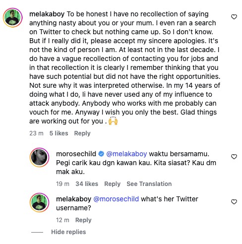 “Beberapa minit lepas hina mak aku dalam Twitter, Melaka Boy DM mak aku, kenakan mak aku dengan ayat nak jumpa, nak bagi aku kerja.