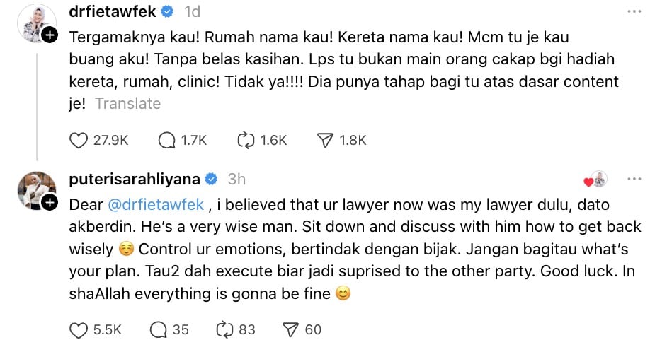 Menurut Puteri Sarah dalam ciapannya di platform Threads, peguam yang mewakili Dr Fie adalah peguam yang turut membantunya sewaktu proses penceraiannya dahulu iaitu Datuk Akberdin Abdul Kadir.