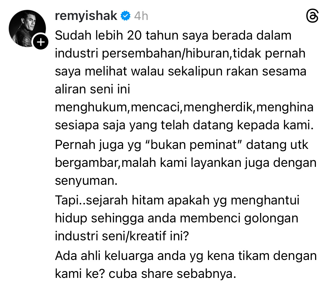 Pelakon terkenal, Remy Ishak tampil mempertahankan maruah penggiat seni susulan dakwaan seorang personaliti media sosial yang menyifatkan kerjaya lakonan sebagai sumber rezeki tidak halal.