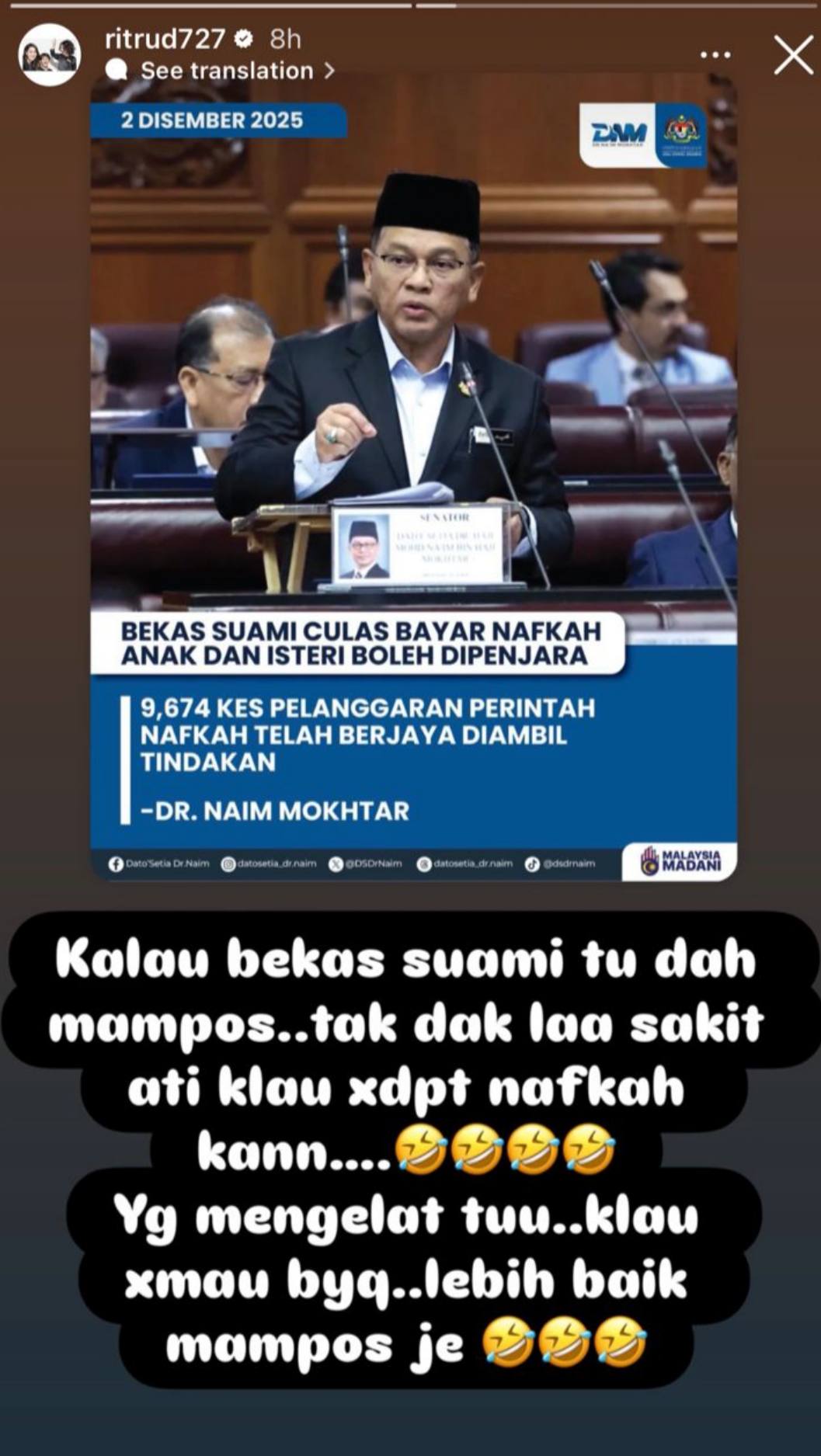Dalam perkongsian di Instagram Story itu, Rita turut berkongsi laporan berita mengenai golongan suami yang gagal membayar nafkah boleh dipenjarakan sesuai dengan saranan yang dikemukakan oleh kerajaan.