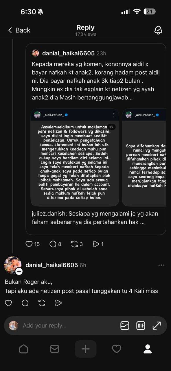 “Dia bayar nafkah anak RM3,000 tiap-tiap bulan. Mungkin bekas isteri dia tak explain kat netizen yang ayah anak-anak dia masih bertanggungjawab,” tulisnya.
