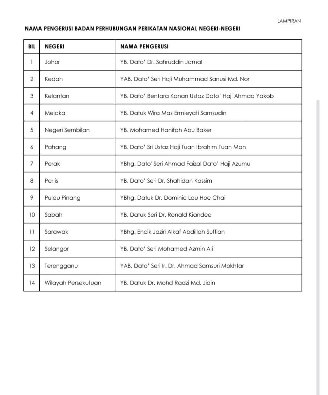 Selain dua perubahan besar itu, beberapa pengerusi negeri lain turut dikekalkan, termasuk Datuk Dr Sahruddin Jamal (Johor), Datuk Seri Muhammad Sanusi Md Nor (Kedah), Datuk Ahmad Yakob (Kelantan), Datuk Wira Mas Ermieyati Samsudin (Melaka) dan Mohamed Hanifah Abu Baker (Negeri Sembilan).