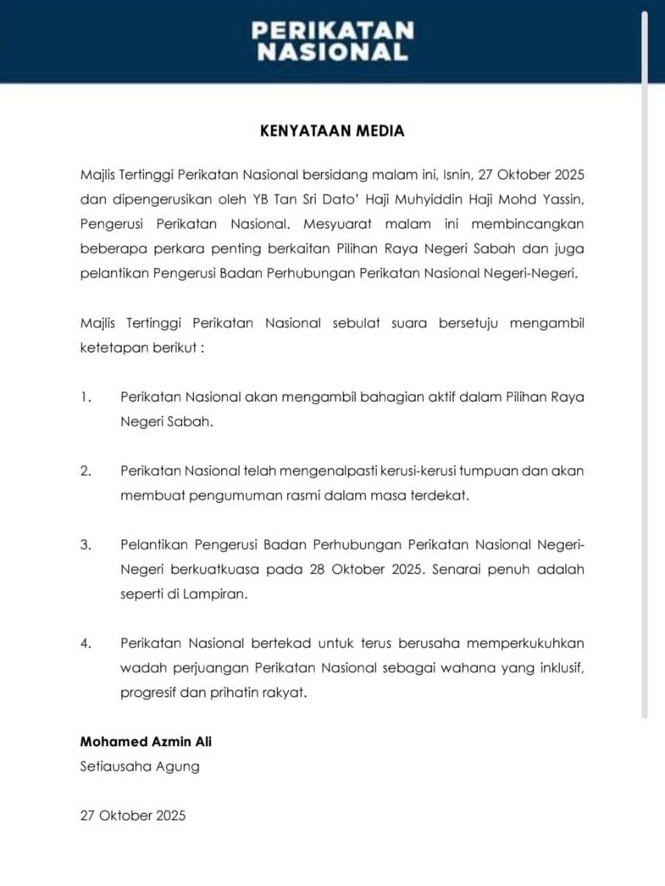 Tambahnya lagi, semua pelantikan baharu berkuat kuasa pada 28 Oktober 2025, dan gabungan itu kini bertekad memperkukuh perjuangan parti demi rakyat.