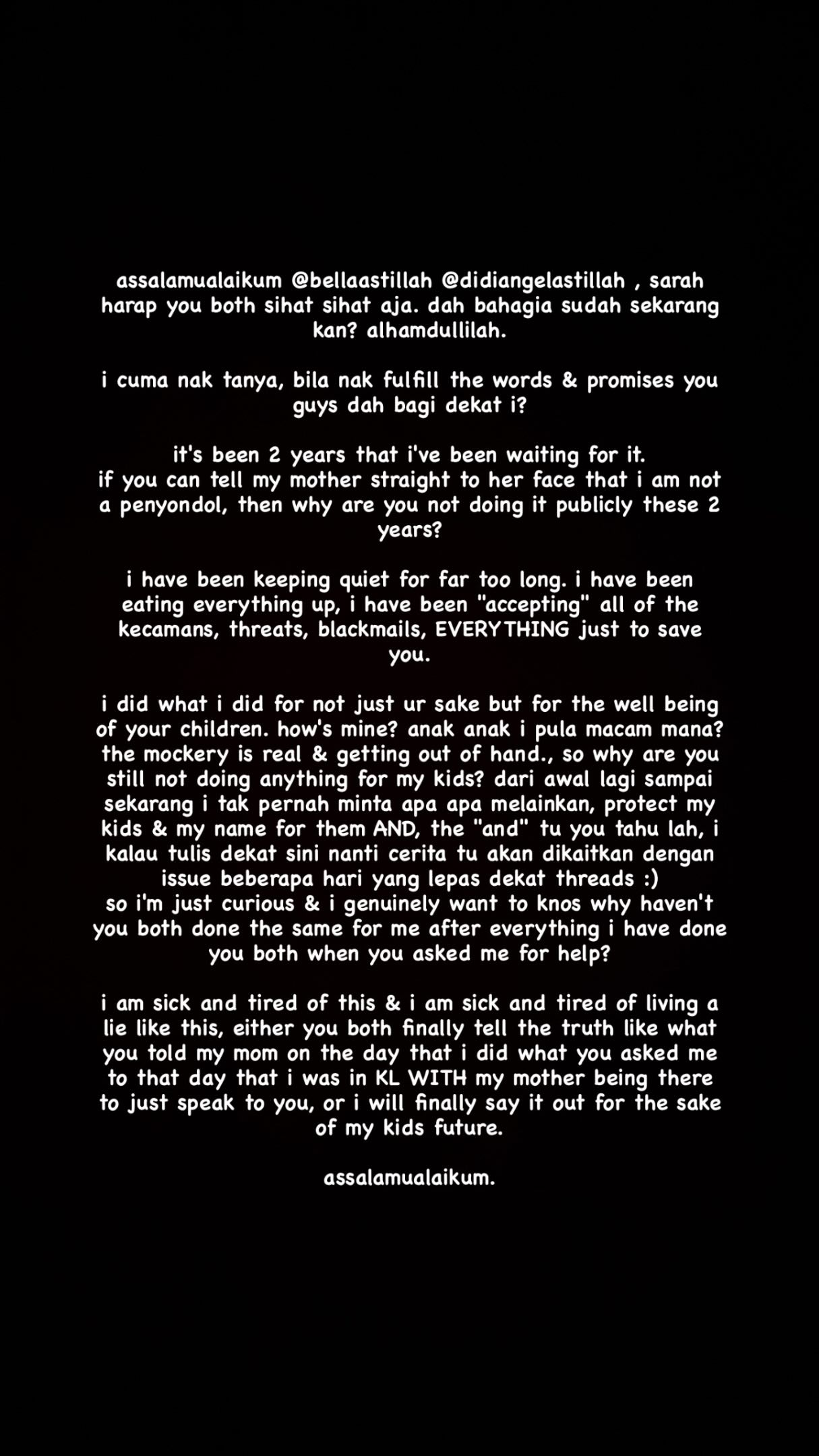 “Saya sudah penat dan muak hidup dalam keadaan begini. Sama ada kamu berdua akhirnya bercakap benar seperti yang kamu katakan kepada ibu saya atau saya sendiri akan mendedahkan perkara sebenar demi masa depan anak-anak saya,” katanya.