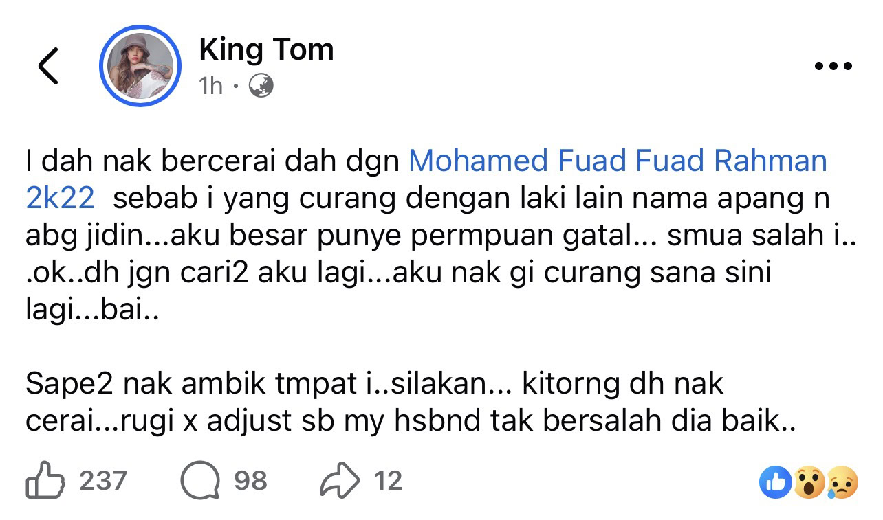“Saya dah nak bercerai dah dengan Mohamed Fuad Fuad Rahman, sebab saya yang curang dengan lelaki lain. Aku besar punya perempuan gatal, semua salah saya.