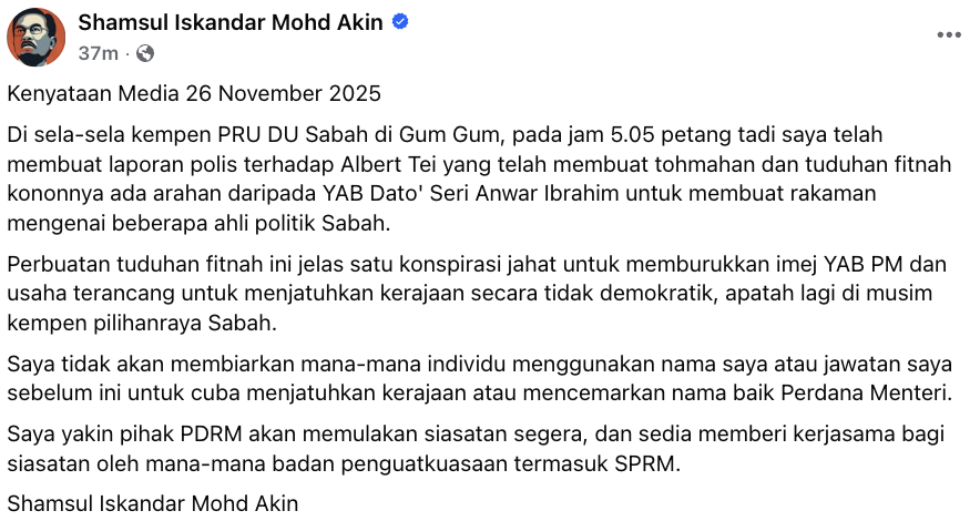 Datuk Seri Shamsul Iskandar Mohd Akin membuat laporan polis terhadap ahli perniagaan Albert Tei yang didakwa menabur fitnah dan konspirasi jahat terhadap Perdana Menteri, Datuk Seri Anwar Ibrahim.