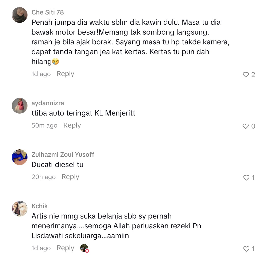 Meninjau ke ruangan komen, warganet memuji sikap Lisdawati yang mesra melayan peminat dan ada juga yang berkogsi pengalaman mereka bertemu bersama selebriti terbabit.