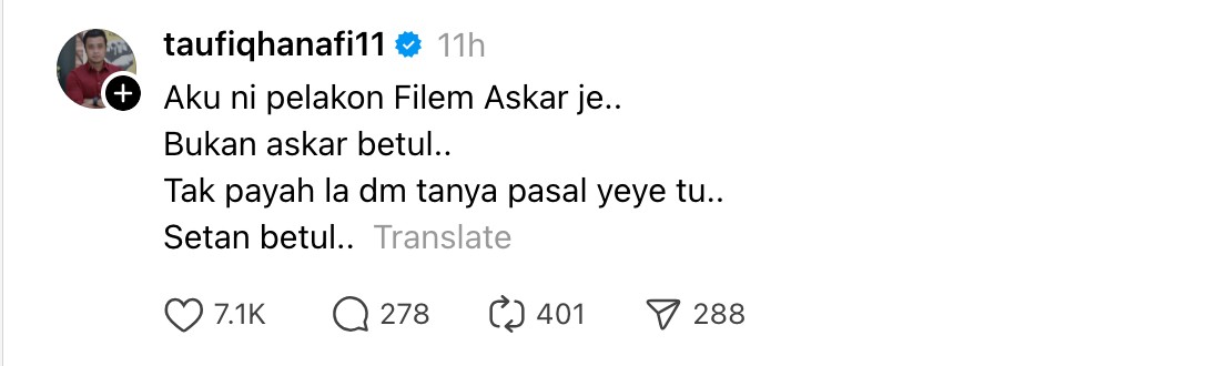 “Aku ni pelakon filem askar je, bukan askar betul. Tak payah la mesej tanya pasal yeye tu,” katanya dalam satu hantaran di Threads, baru-baru ini.