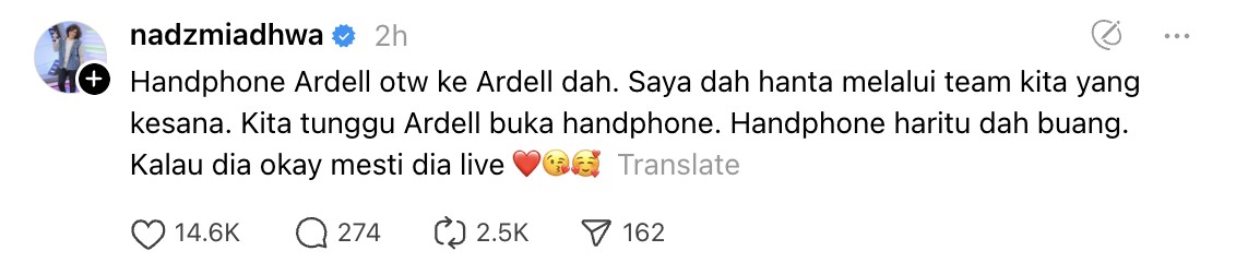 “Handphone Ardell on the way (dalam perjalanan) ke Ardell dah. Saya dah hantar melalui team kita yang ke sana,” tulisnya.