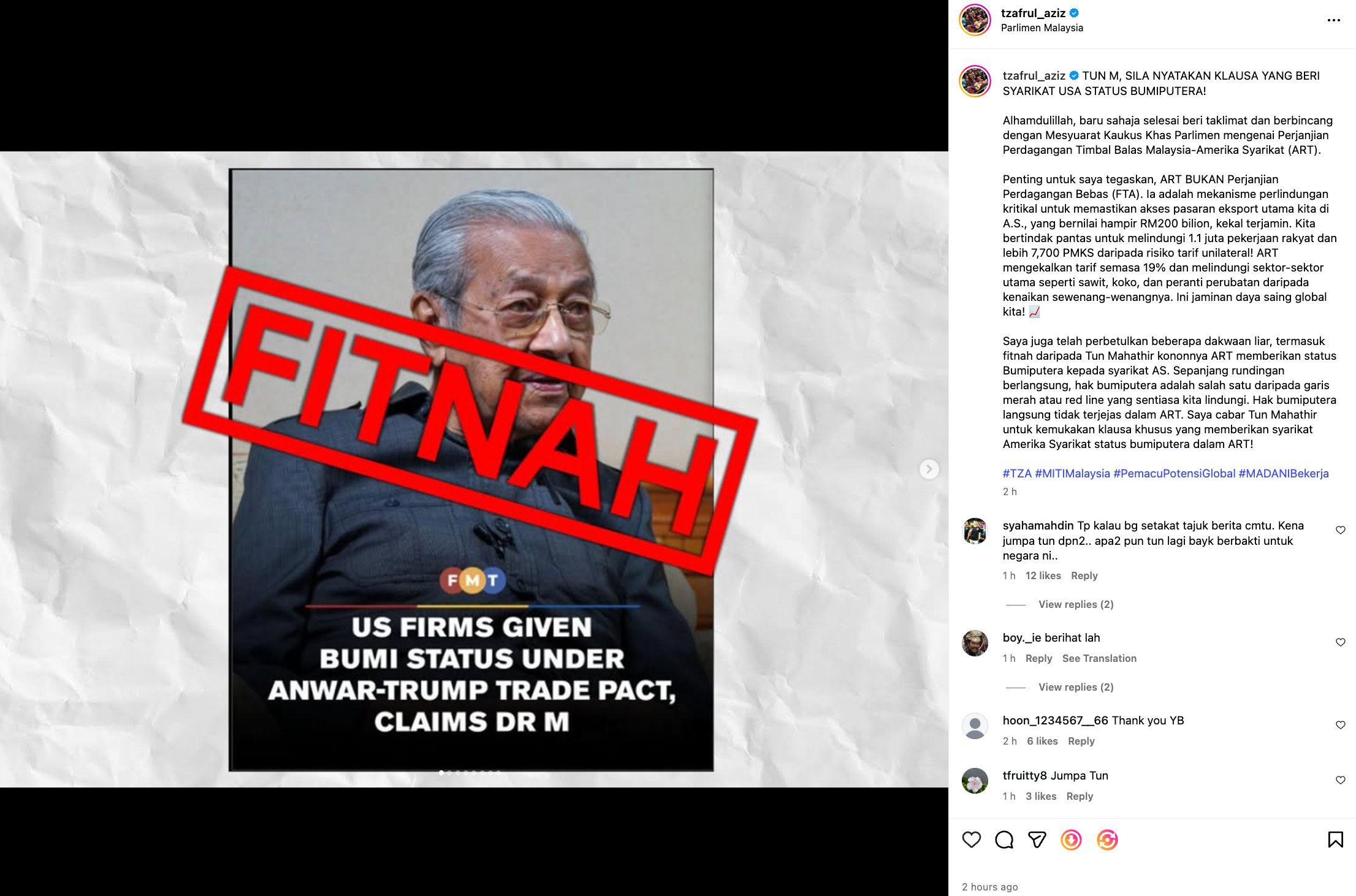 “Hak bumiputera langsung tidak terjejas dalam ART. Saya cabar Tun Mahathir untuk kemukakan klausa khusus yang memberikan syarikat Amerika Syarikat status bumiputera dalam ART,”katanya di hantaran media sosial hari ini, selepas memberi taklimat dalam Mesyuarat Kaukus Khas Parlimen mengenai ART di Parlimen.