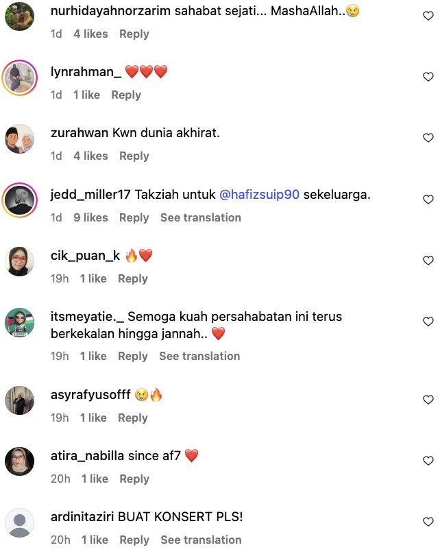 Mereka juga mendoakan agar hubungan mereka terus berkekalan dan berharap supaya Hafiz kembali bangkit serta memeriahkan lagi industri seni tanah air.