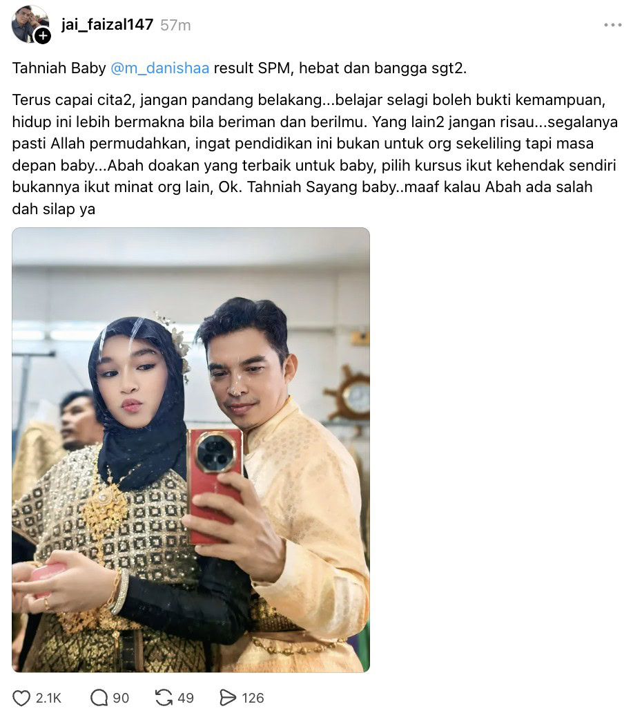 Suami kepada pelakon, Abby Abadi, Muhammad Faizal Zakaria mengucapkan tahniah kepada Maria Danisha Hakim, anak ketiga isterinya diatas keputusan Sijil Pelajaran Malaysia (SPM) yang diperoleh kelmarin.