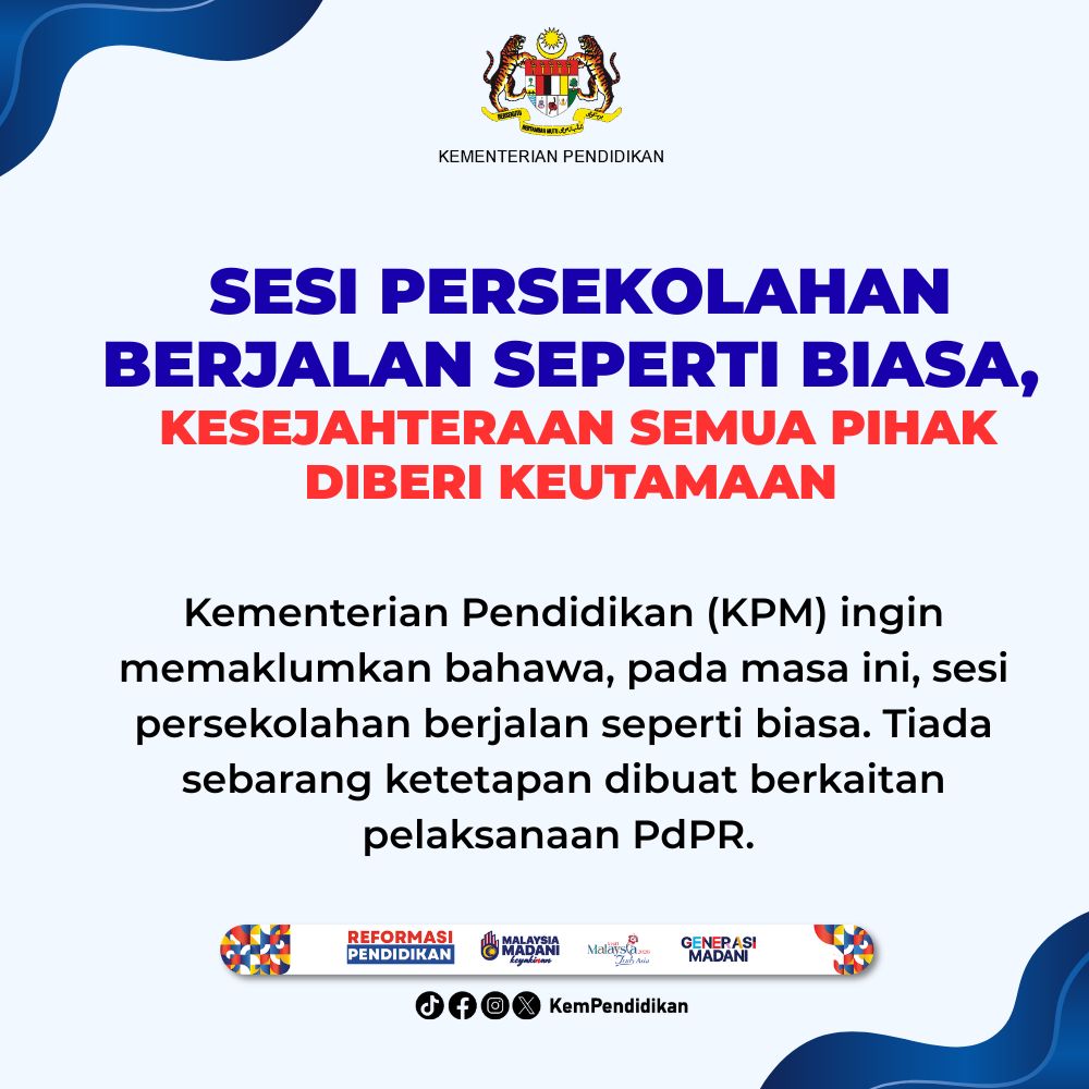Kementerian Pendidikan (KPM) menegaskan sesi persekolahan di seluruh negara berjalan seperti biasa dan tiada sebarang keputusan mengenai pelaksanaan Pengajaran dan Pembelajaran di Rumah (PdPR) dibuat buat masa ini.