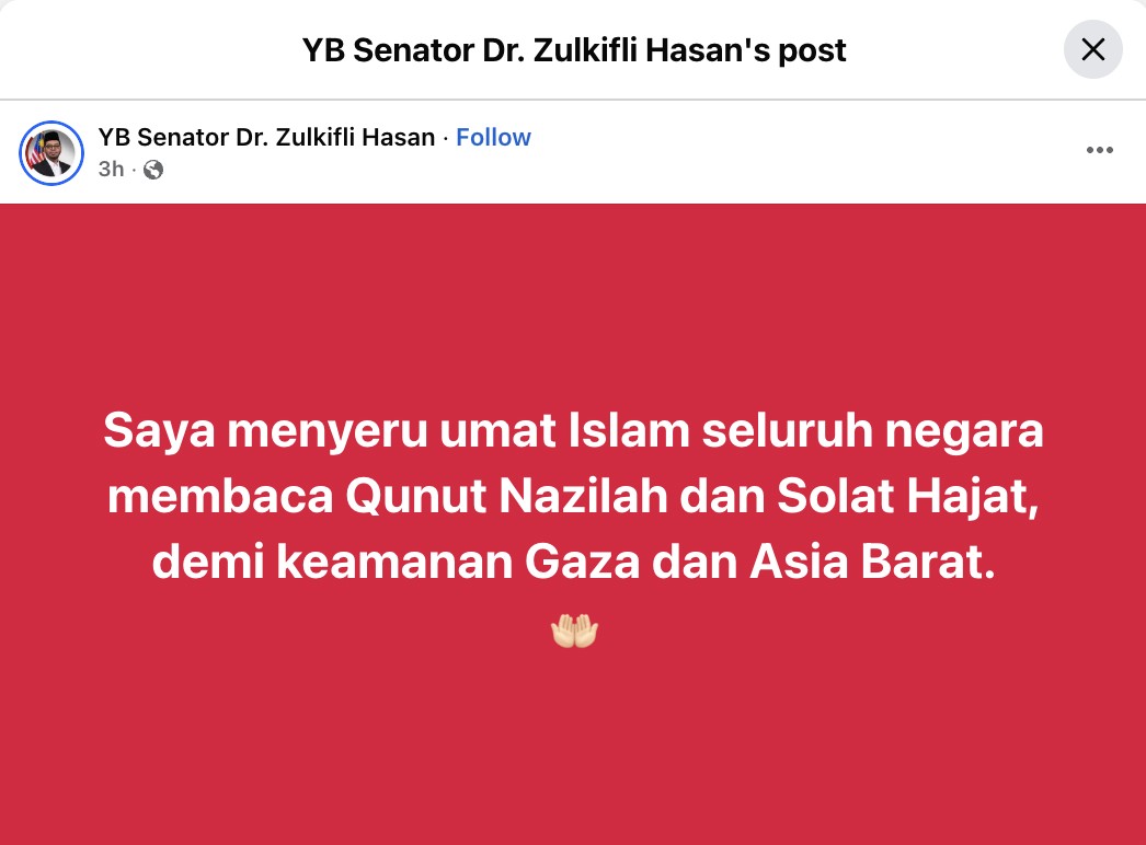 “Saya menyeru umat Islam seluruh negara membaca Qunut Nazilah dan Solat Hajat demi keamanan Gaza dan Asia Barat,” katanya menerusi hantaran di Facebook, hari ini.