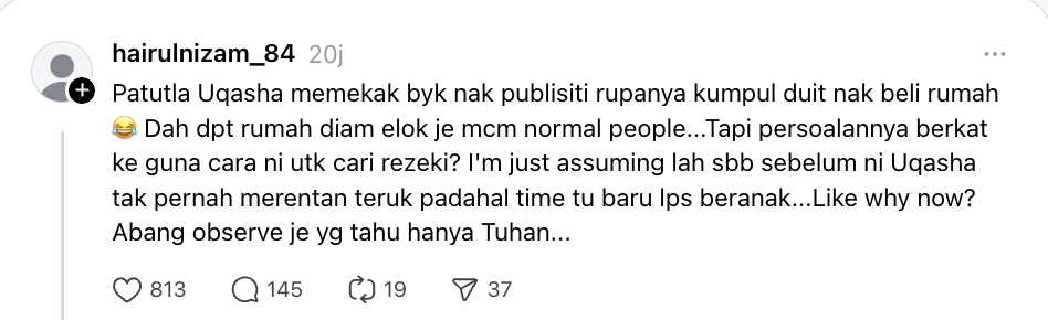 “Patutlah Uqasha memekak, banyak nak publisiti rupanya kumpul duit nak beli rumah. Dah dapat rumah, diam elok je macam orang normal.