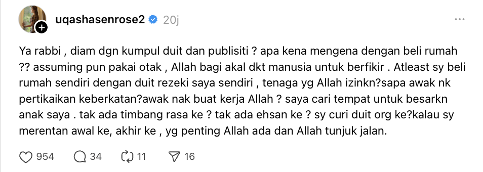 “Tapi persoalannya berkat ke guna cara ini untuk cari rezeki? Saya cuma andaian sebab sebelum ini Uqasha tak pernah merentan teruk walaupun waktu itu baru lepas beranak. Kenapa sekarang? Saya cuma memerhati, yang tahu hanya Tuhan,” tulis individu itu.