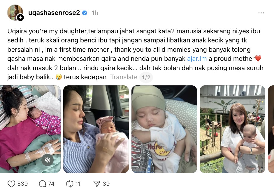 Uqasha Senrose sedih, anak jadi mangsa kecaman -“Teruk sekali orang benci ibu”