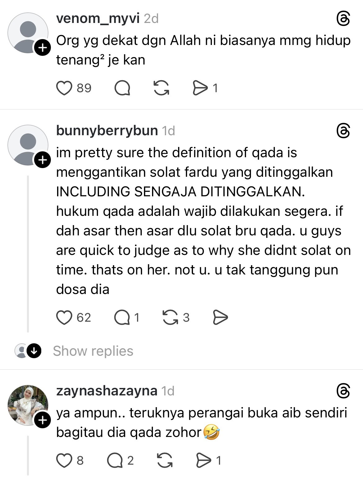 Namun, perhatian netizen tertumpu apabila isteri kepada aktor Aiman Hakim Ridza itu terpaksa mengqada solat Zohor akibat komitmen kerja yang tidak dapat dielakkan.
