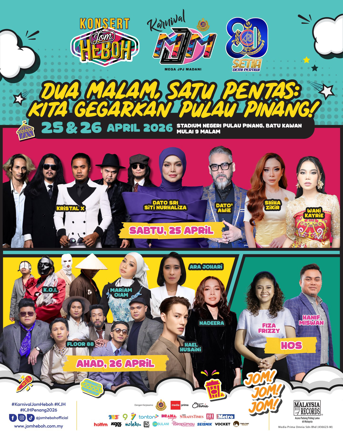 Dalam pada itu, Siti Nurhaliza dijadualkan membuat kemunculan istimewa bergandingan dengan legenda rock, Datuk Awie pada konsert Jom Heboh malam ini, yang turut menampilkan barisan artis popular tanah air termasuk Shiha Zikir, Kristal X dan Wani Kayrie, sekali gus dijangka menarik ribuan pengunjung sebagai kemuncak acara.