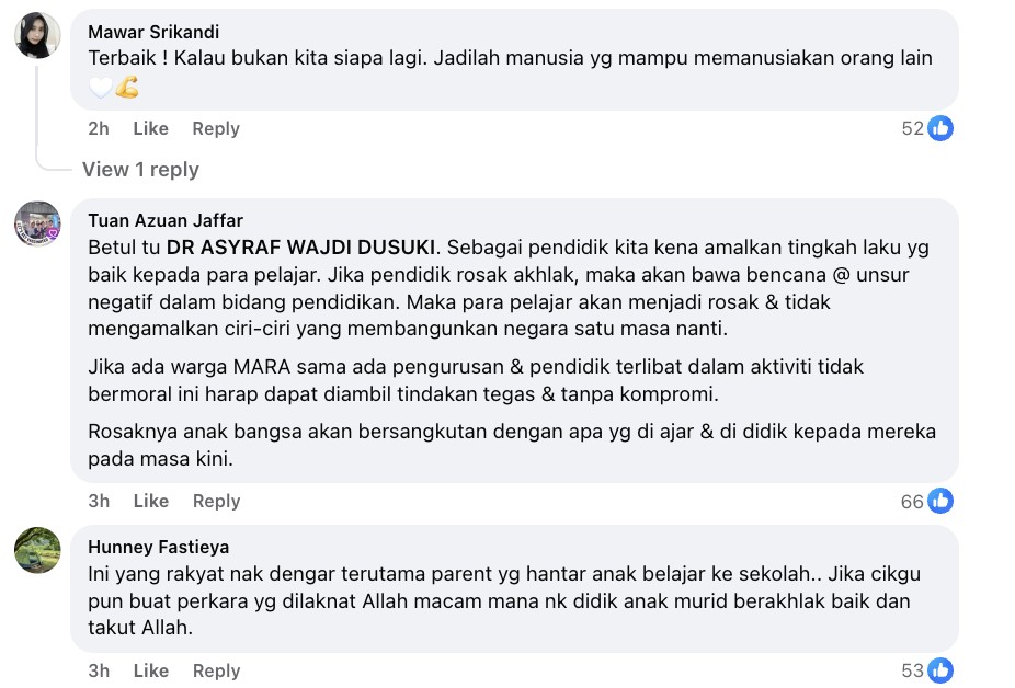 Meninjau ke ruangan komen, rata-rata netizen menyokong tindakan tegas ini dan memuji ketegasan MARA dalam memastikan kakitangannya mematuhi standard moral selain bertanggungjawab terhadap masa depan generasi muda.
