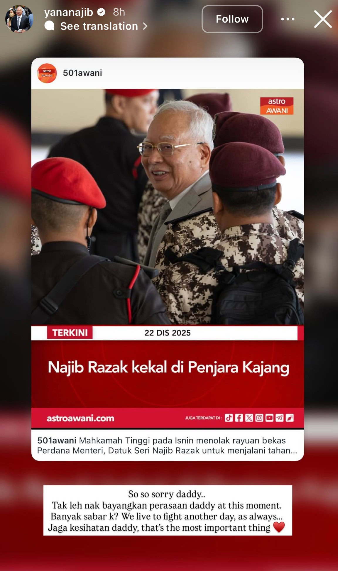 Anak kepada bekas Perdana Menteri, Datuk Seri Najib Tun Razak, Nooryana Najwa atau Yana Najib meluahkan rasa sedih dan hiba susulan keputusan Mahkamah Tinggi yang mengekalkan bapanya menjalani baki hukuman penjara di Penjara Kajang.