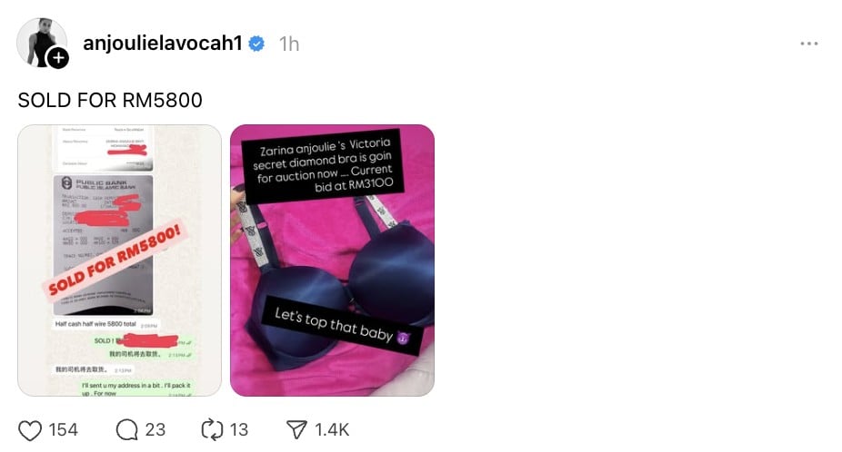 Zarina Anjoulie lelong baju dalam terpakai, individu berjaya bida RM5,800