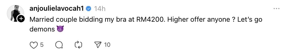 Menerusi platform Threads, Zarina atau nama penuhnya Zarina Anjoulie Lavocah Mohd Fahizul, 39, memaklumkan pada awalnya terdapat pasangan suami isteri yang sanggup membida pakaian dalam tersebut sehingga RM4,200.