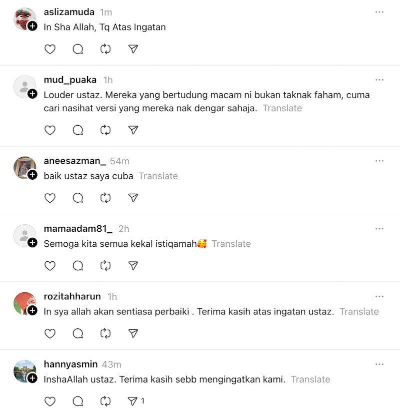 Menjengah ke ruangan komen, rata-rata netizen mengambil positif teguran yang diberikan oleh Ustaz Wadi Annuar dan akan cuba memperbaiki diri dalam menjadi seorang muslimah yang lebih baik.
