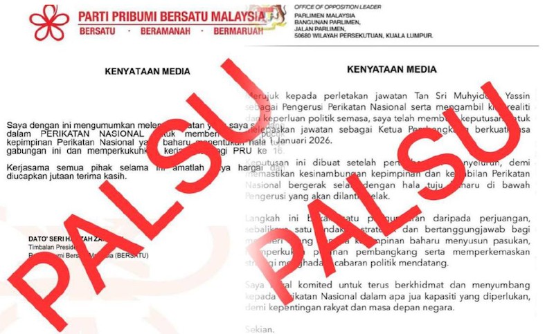 Pejabat Ketua Pembangkang memaklumkan surat perletakan jawatan Datuk Seri Hamzah Zainudin yang tersebar di media sosial adalah palsu dan tidak benar.