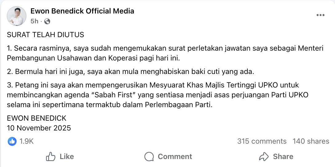 Ewon sebelum ini mengumumkan peletakan jawatan kerana tidak bersetuju dengan pendirian Jabatan Peguam Negara (AGC) berhubung isu hak 40 peratus hasil Sabah di bawah Perjanjian Malaysia 1963 (MA63).