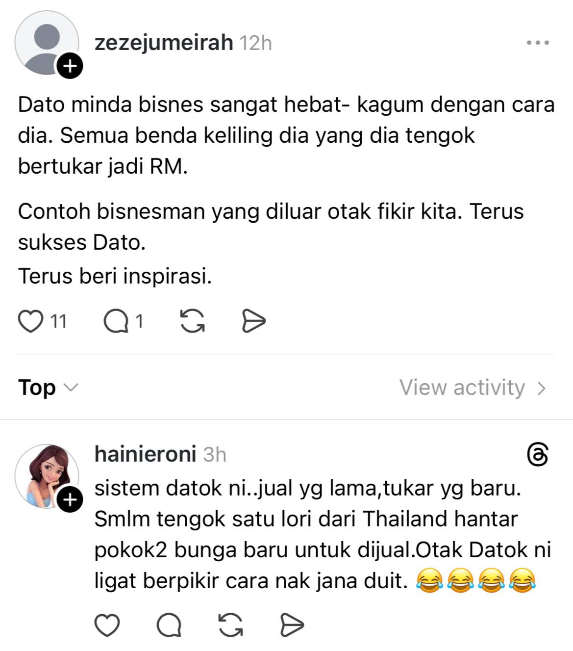 Malah ada juga yang memuji cara usahawan itu bijak meniaga dan tidak melepaskan peluang dalam melihat sesuatu yang berpotensi mampu menjana pendapatan.