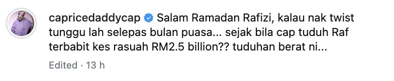 “Salam Ramadan Rafizi, kalau nak twist tunggu lah selepas bulan puasa… sejak bila Cap tuduh Raf terbabit kes rasuah RM2.5 billion tuduhan berat ni,” soal Caprice, tengah malam tadi.