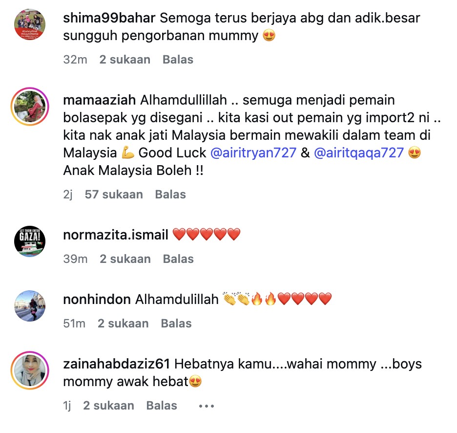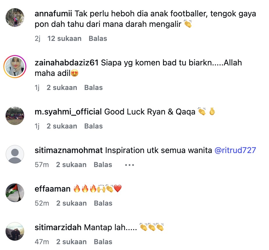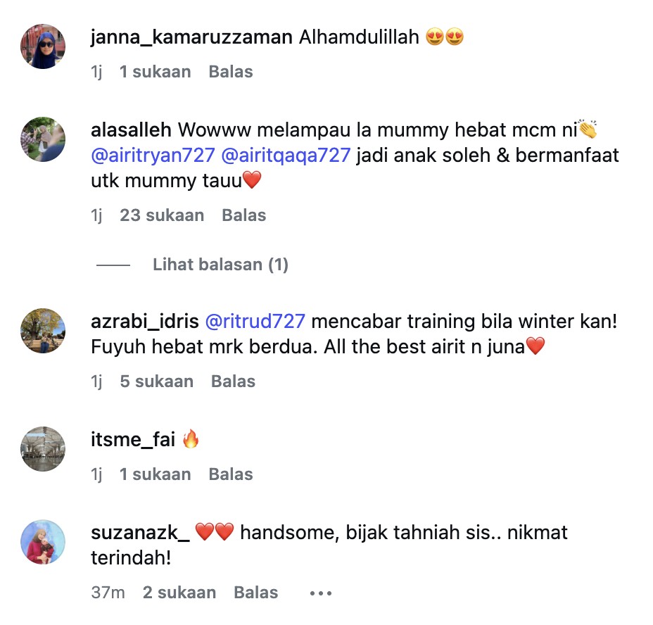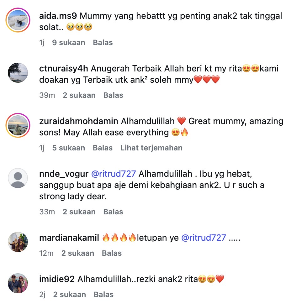 Perkongsian tersebut turut menerima pelbagai reaksi positif daripada pengikutnya yang memuji pengorbanan Rita sebagai seorang ibu serta menyifatkan peluang latihan di luar negara itu sebagai pengalaman bermakna buat anak-anaknya.