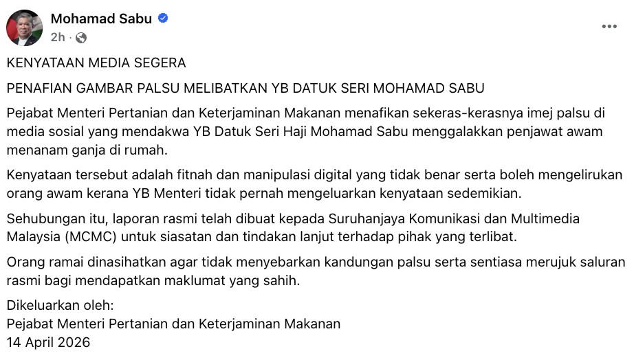 “Pejabat Menteri Pertanian dan Keterjaminan Makanan menafikan sekeras-kerasnya imej palsu di media sosial yang mendakwa YB Datuk Seri Haji Mohamad Sabu menggalakkan penjawat awam menanam ganja di rumah.
