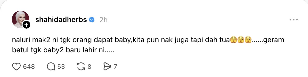 Menerusi perkongsian di Threads, Shahida meluahkan rasa gembira setiap kali melihat bayi yang baru dilahirkan, malah mengakui naluri keibuannya masih kuat meskipun usia semakin meningkat.